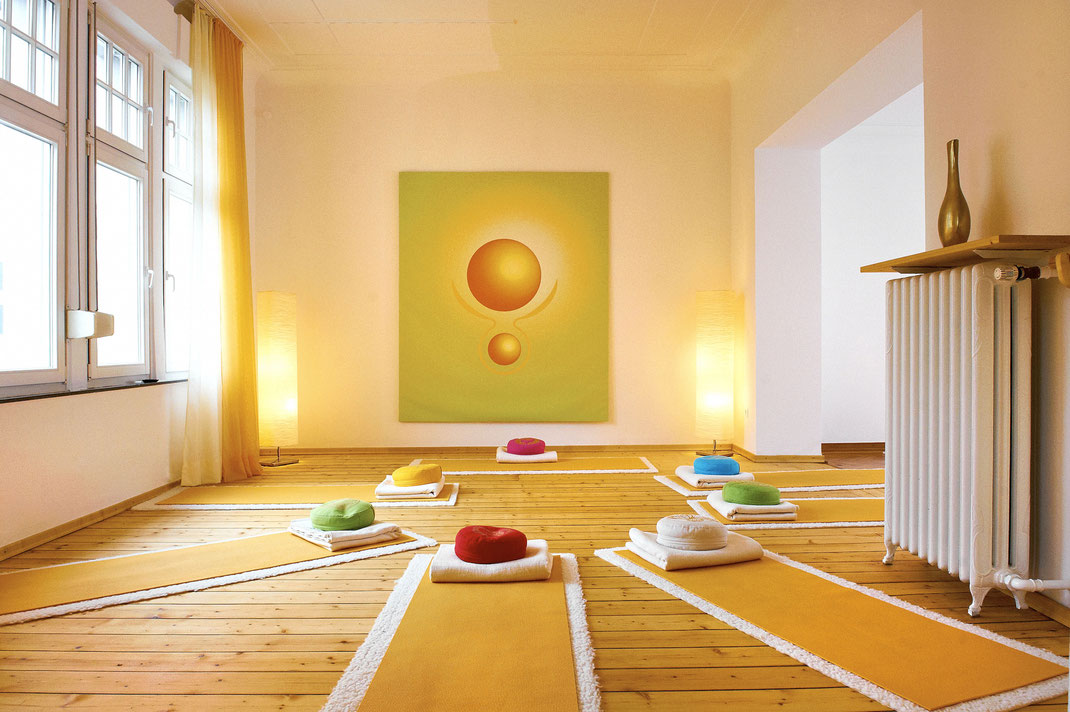 - Yogazubehör wie Matten, Kissen, Decken Gurte, Klötze